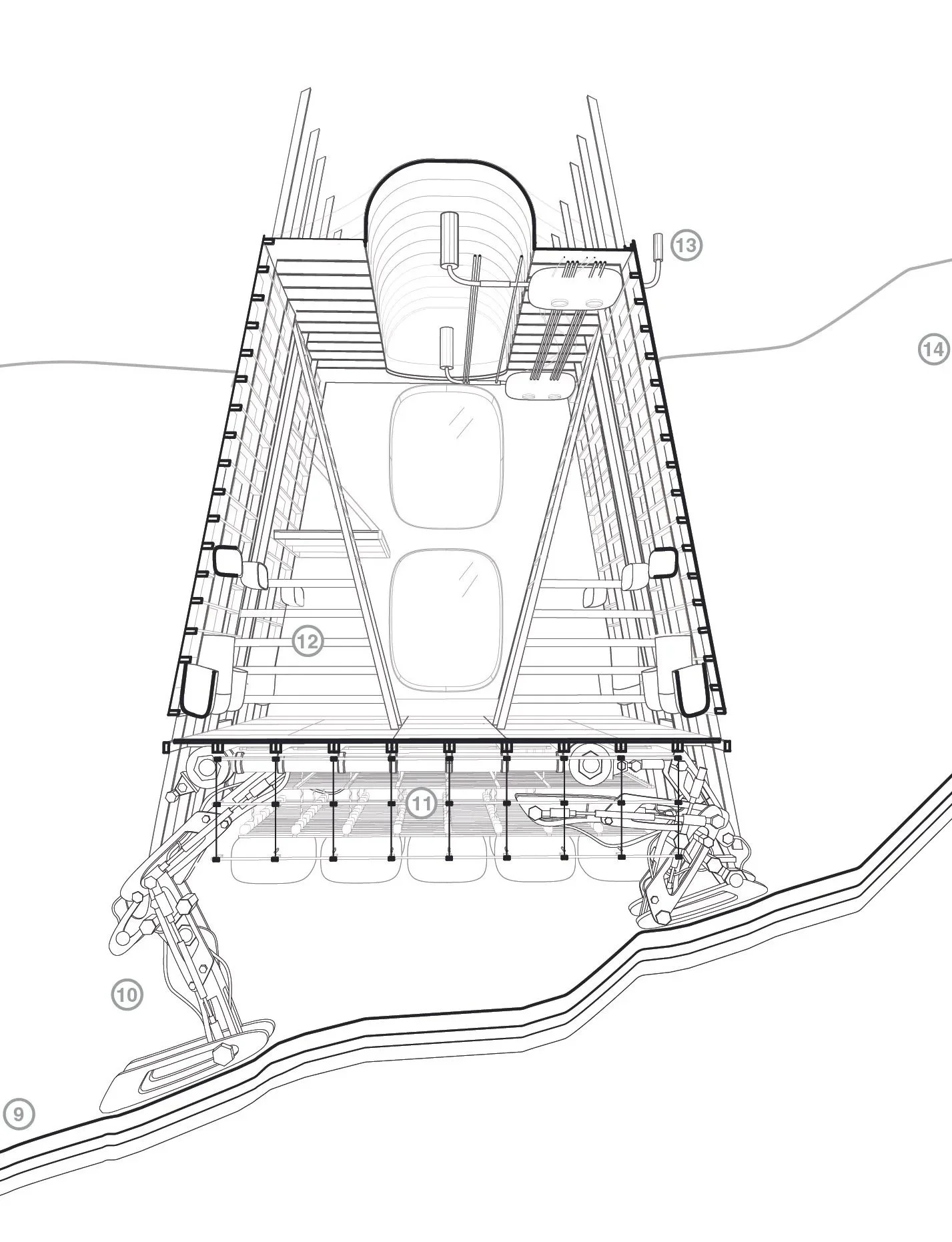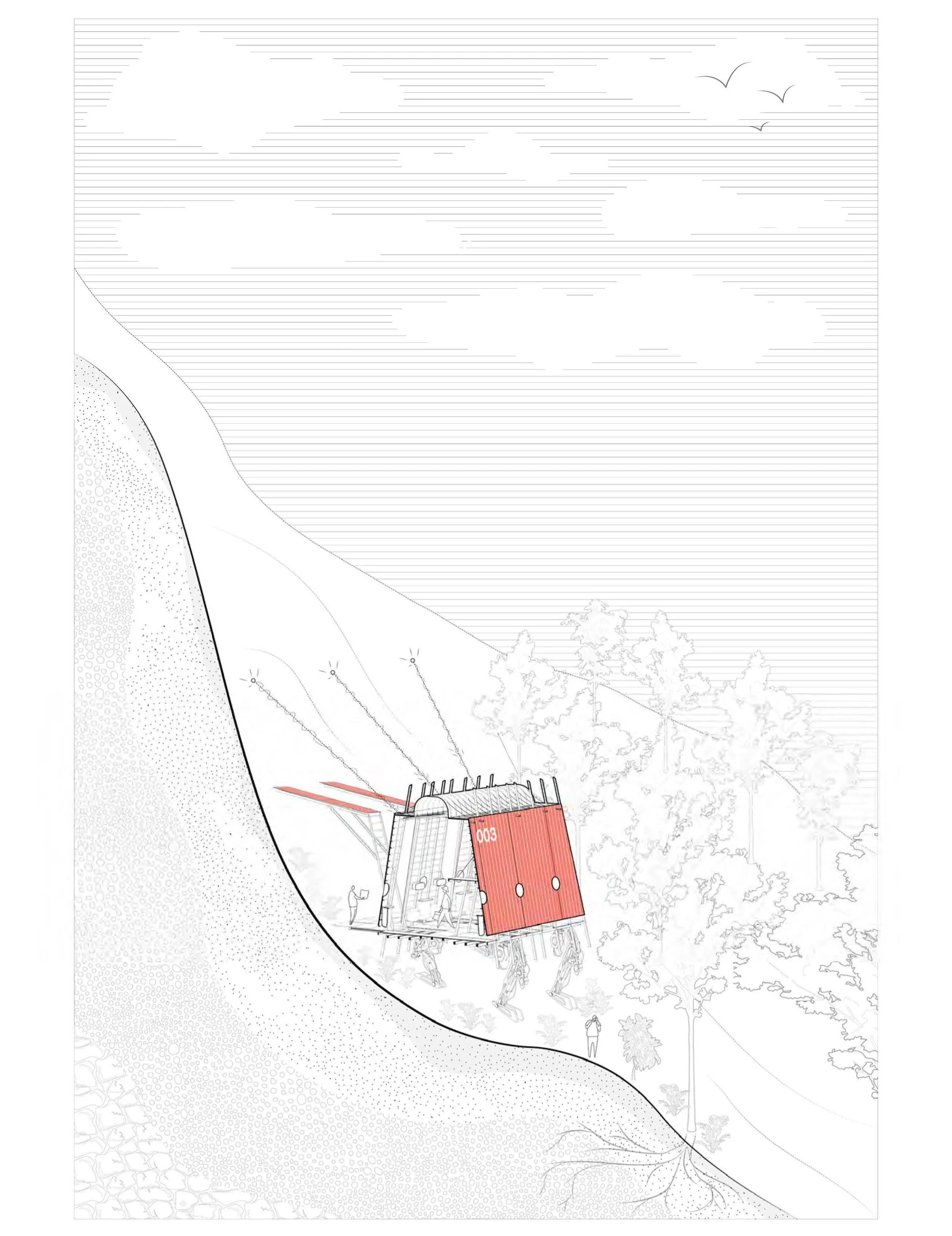 At the island’s topographic crest, the PODs converge at “The Ridge,” a mass-timber structure anchored into the highest and most stable terrain on Litløya. Conceived as both infrastructural core and architectural mediator, the Ridge functions as the collective home base for the mobile research network. Here, the PODs dock and recharge, drawing power from energy-collection systems adapted and expanded from the lighthouse itself, while transferring data samples and personnel between field and base.