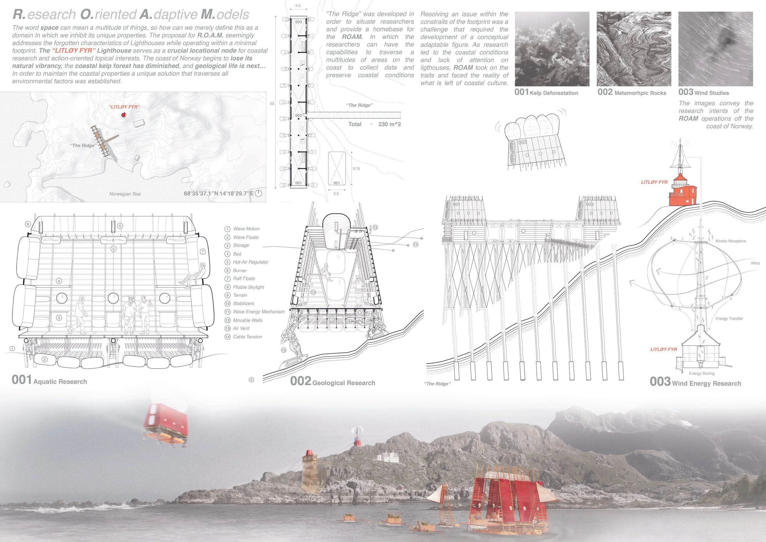“The Ridge” was developed in order to situate researchers and provide a homebase for the ROAM. In which the researchers can have the capabilities to traverse a multitudes of areas on the coast to collect data and preserve coastal conditions.