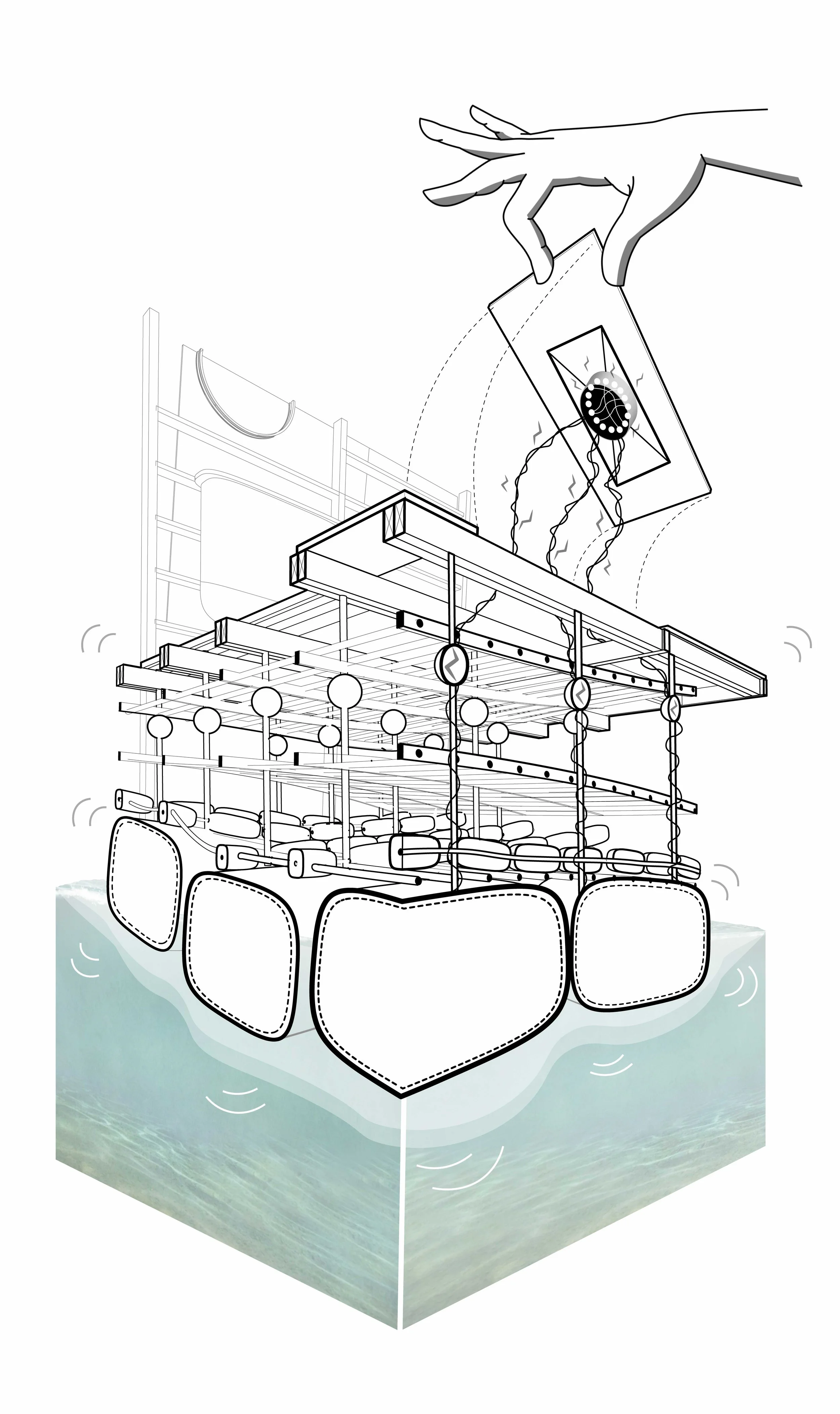 For aquatic operation, the POD employs a modular flotation base composed of multiple sealed inflatable pontoons rather than a single buoyant chamber. Each pontoon is independently pressurized and compartmentalized, providing redundancy and stability in rough water conditions. This distributed buoyancy allows the POD to remain afloat even if individual chambers are compromised, while dynamic pressure control enables it to adjust its center of buoyancy in response to wave action. The inflatable elements are fabricated from abrasion-resistant, marine-grade membranes, allowing the POD to absorb impact, dampen motion, and maintain equilibrium as it drifts or stations itself in open coastal waters.
