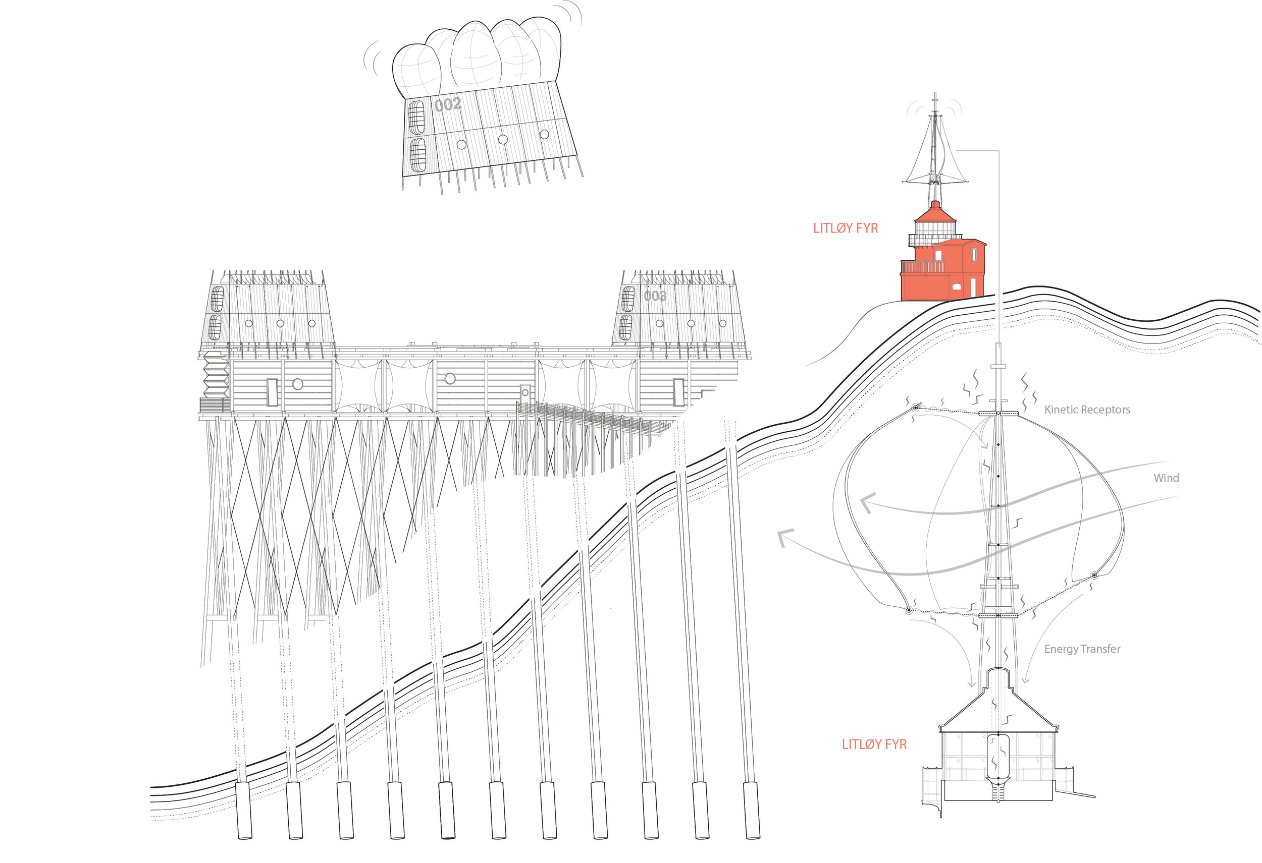 The proposed solution for this Re:Form competition entry envisions the transformation of one such remote lighthouse into a modern research station. We preserve its historical presence and expand its capabilities with new architectural interventions inspired by modularity and innovative research techniques. These additions (a series of movable pods) are situated on the Ridge, adjacent to the original lighthouse. Drawing from vernacular timber-clad geometries, the new structures would echo the landscape and climate while providing functional spaces for environmental research and observation in varying site conditions.