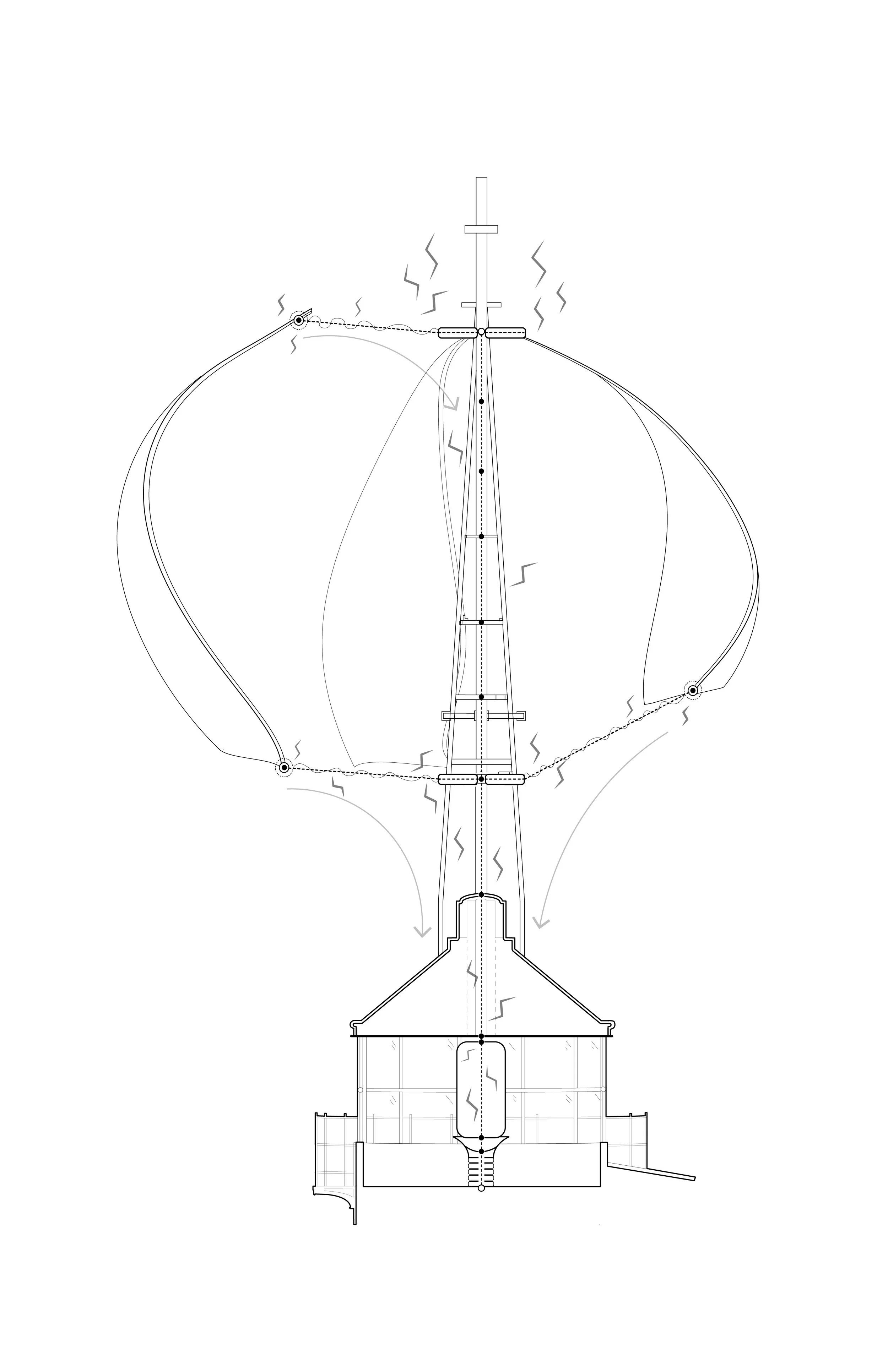 Section through the lighthouse showing the integration of wind-capture technology, where a sail mounted atop the existing structure harvests prevailing winds to generate power for the broader research campus.
