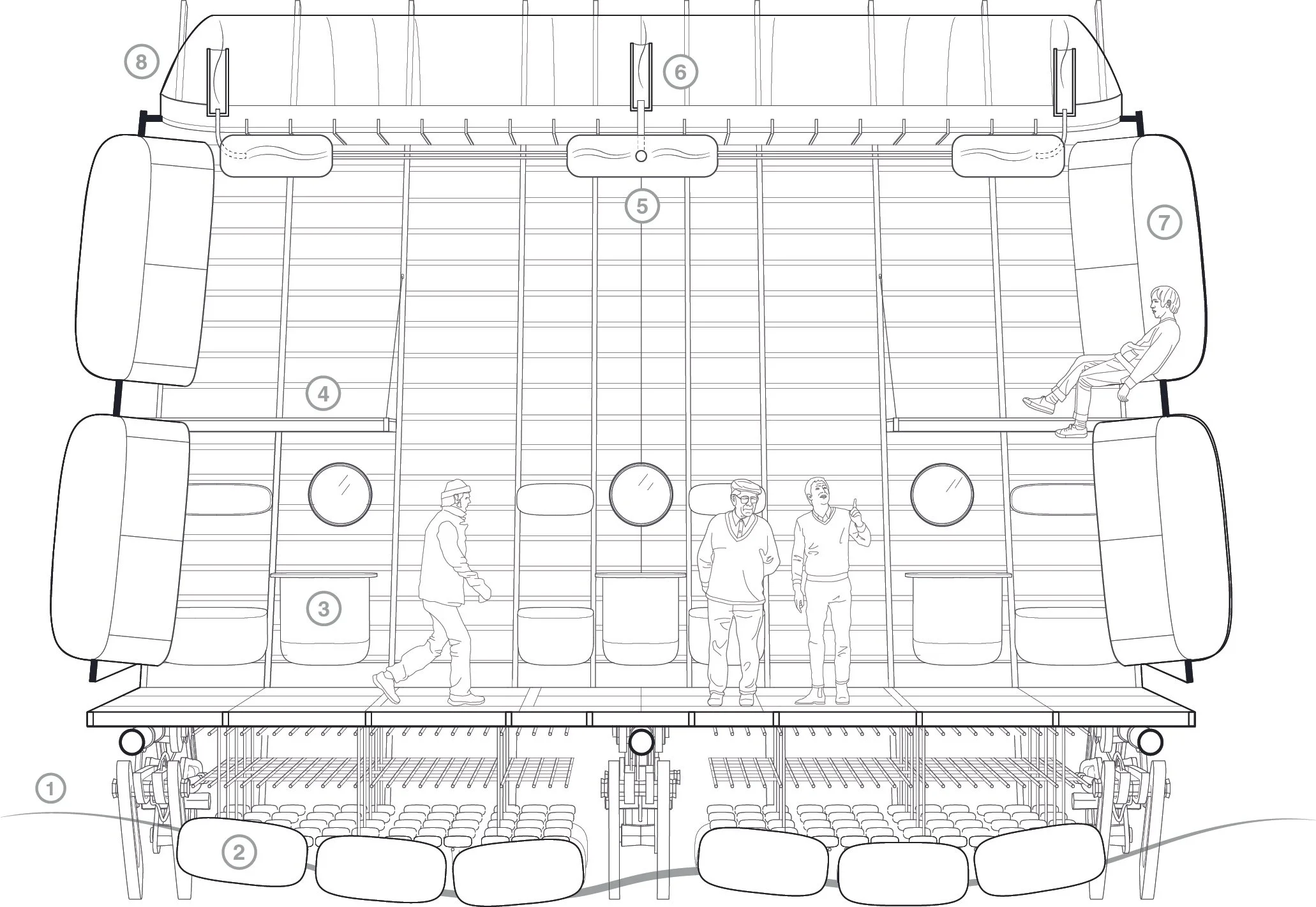 Linear and proportionally thin, the plan cuts through the Ridge’s primary occupiable level, revealing a continuous infrastructural spine that houses generators, charging interfaces, and semi-permanent research technologies supporting island-wide operations.