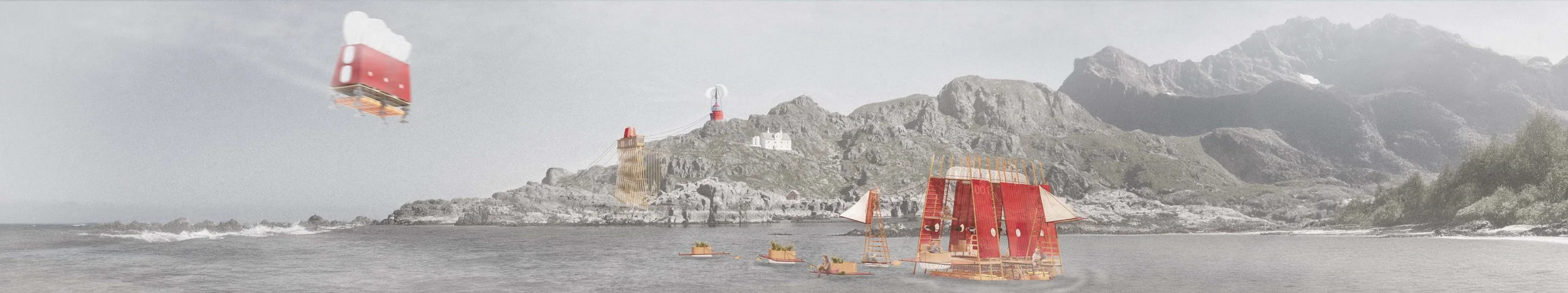Distributed across Litløya, the ROAM PODs are lightweight, multi-functional research structures designed to operate in direct continuity with the island’s extreme terrain and shifting environmental conditions. Rather than occupying fixed sites, they move deliberately through the landscape: traversing steep, uneven ground on omnidirectional articulated legs, floating across ponds and coastal waters on a buoyant flotation base, and drifting through the air by means of a controllable inflatable element. This capacity for terrestrial, aquatic, and aerial movement allows each POD to engage the island as a dynamic field rather than a static backdrop.