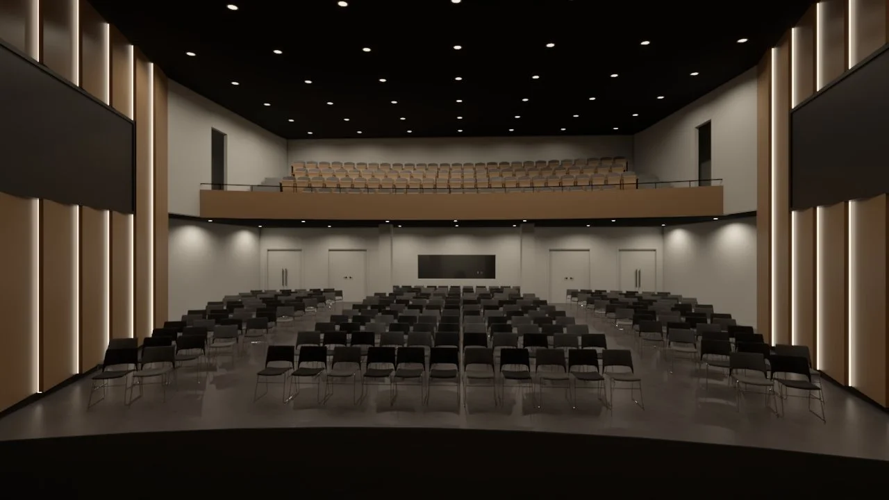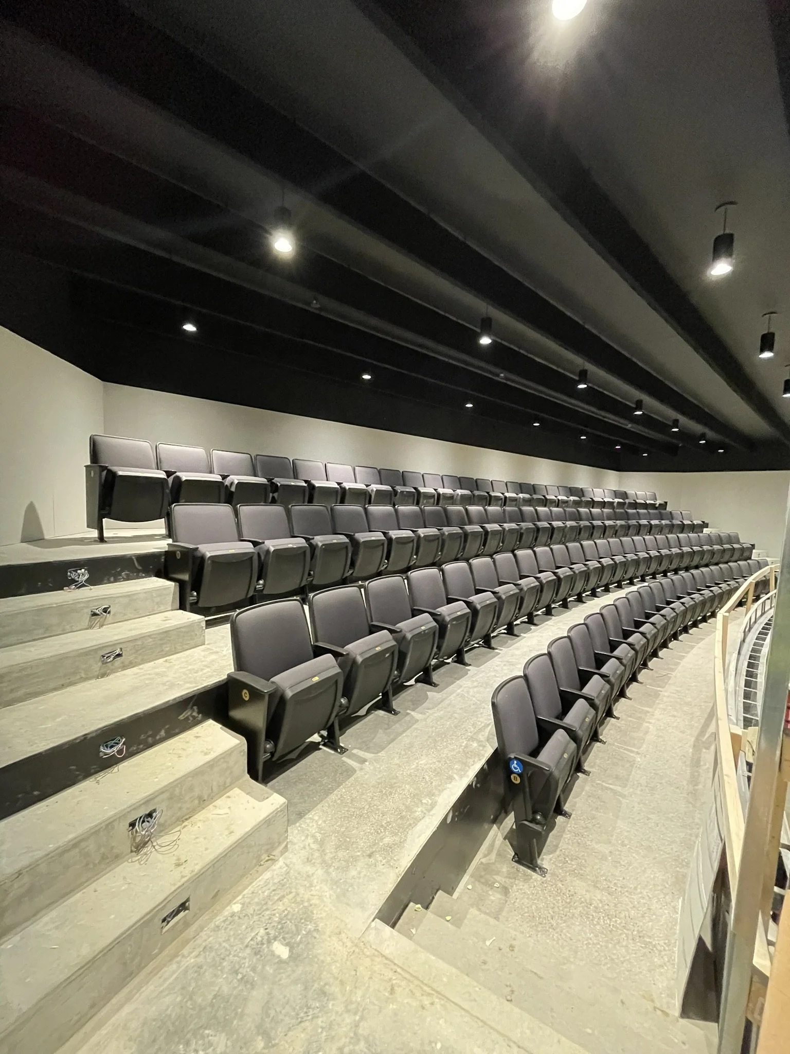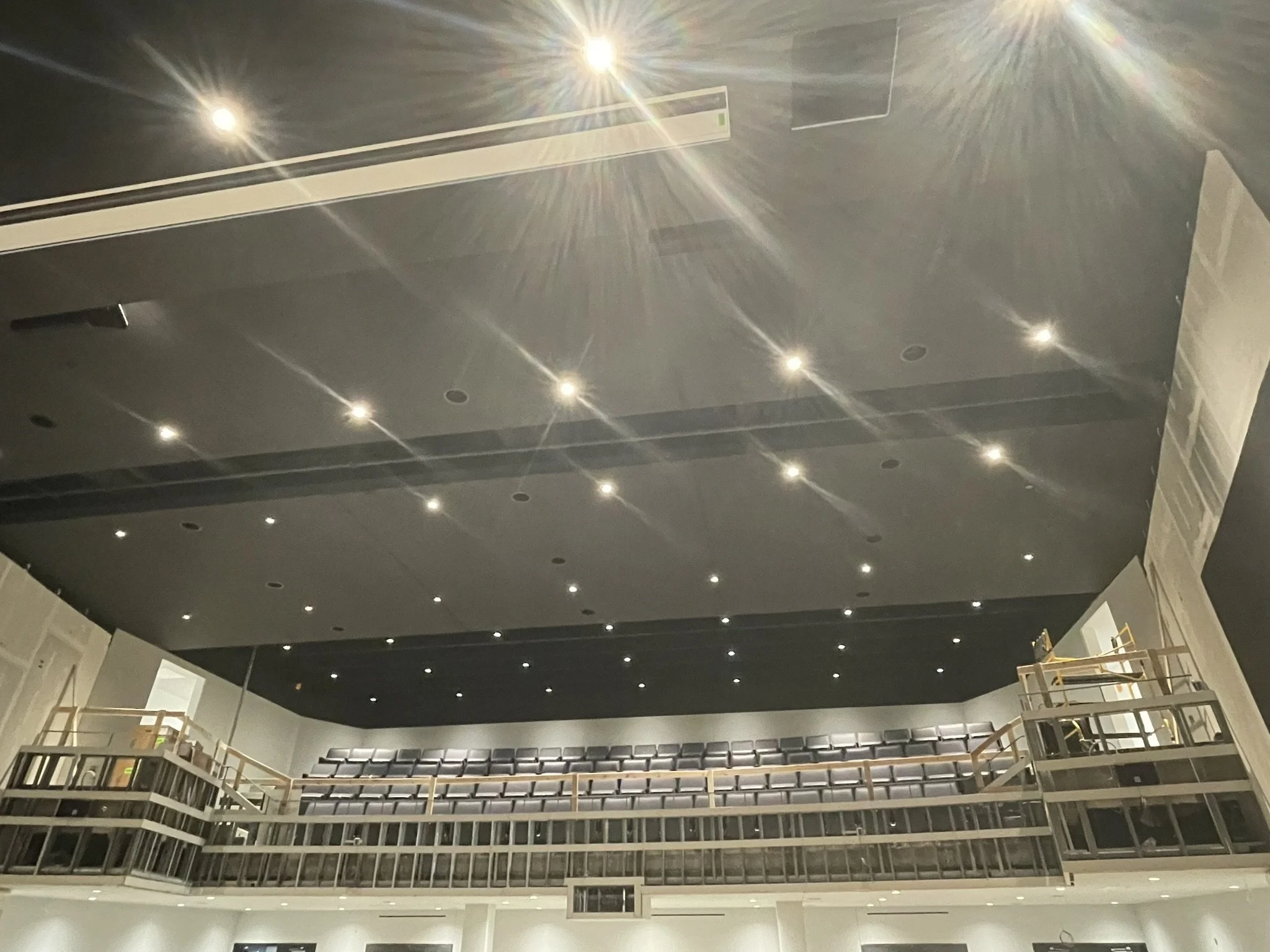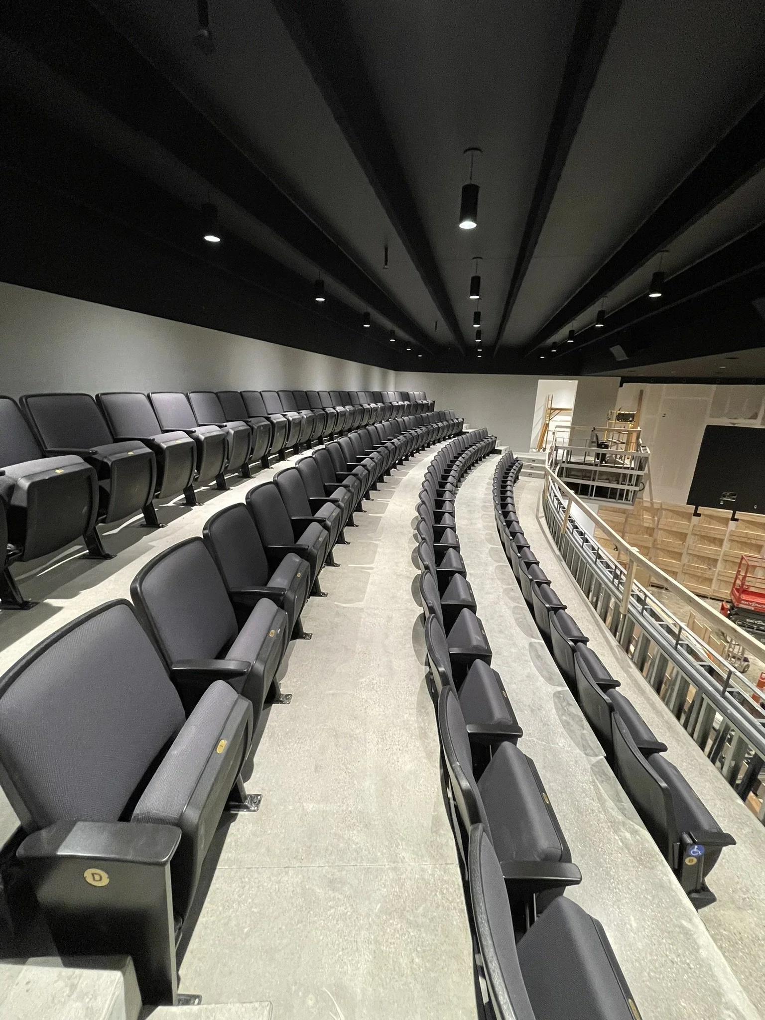 At Thomas More University, construction is nearly complete of a hybrid-auditorium [expected completion May 2024]. This new facility will accommodate lecture, performance, and banquet functions. The main level includes a raised stage with AV technology for presentation and display. Walls flanking the stage feature displays, confidence monitors in the balcony, and a distributed sound system support this use. There is also stage depth, rigging, and lighting available for moderate productions.