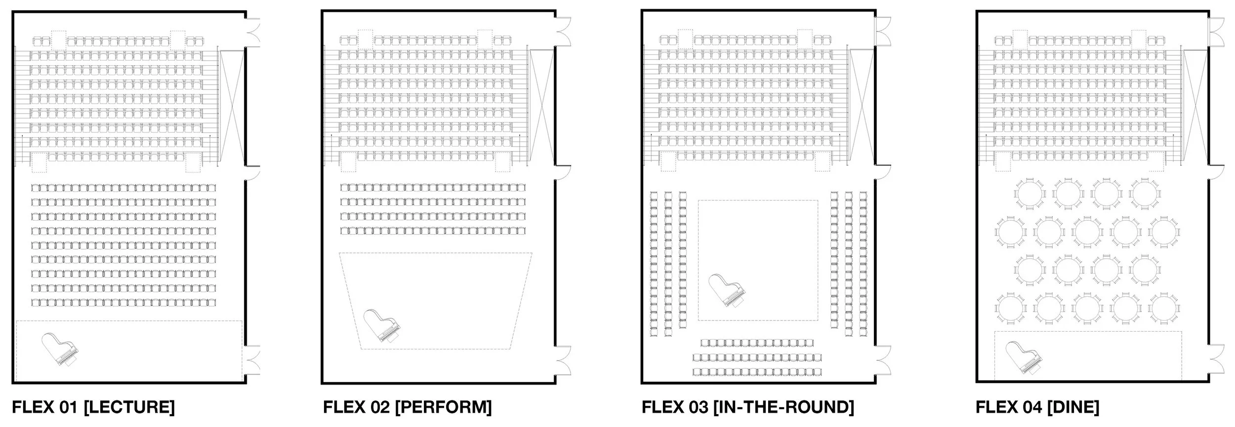 The audience configuration for the auditorium on the first floor is designed to be flexible. Designed with a flat floor seating on this level is provided with loose furniture that can be stored to clear the room. In a lecture configuration, seating on this level can accommodate 300 people. Other uses for this level of the auditorium may include banquets, symposia, or other gatherings. Storage is provided at the back of the auditorium to allow for furniture turn over.